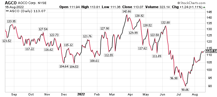 Connell said she put AGCO through one of her financial screening tools and it showed the stock possessed “very strong fundamentals, as well as momentum.” She indicated the share price has upside of 30% from current levels.