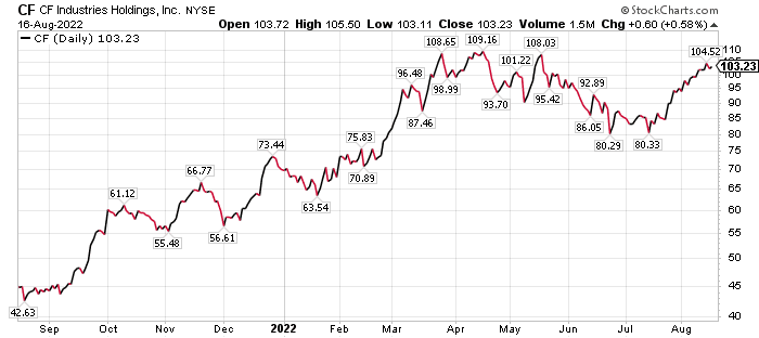 Yet another big fan of CF Industries Holdings is Mark Skousen, PhD, who recently recommended it profitably in his Five Star Trader advisory service. Skousen also follows commodities closely as the head the Forecasts & Strategies investment newsletter.
