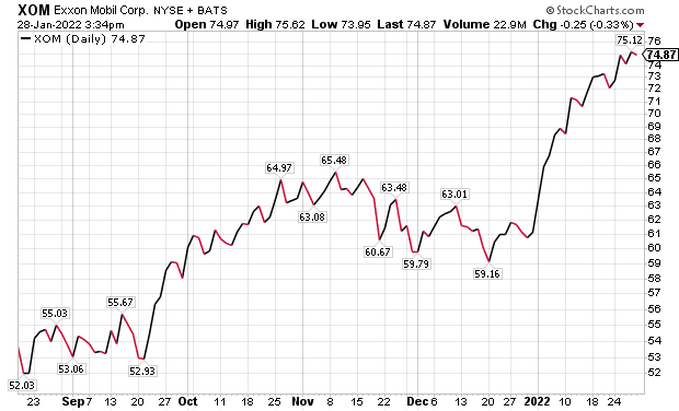 Exxon Mobil Corp. (NYSE: XOM) shares traded above $70 on Tuesday, Jan. 11, to reach a new 52-week high. The stock also pays a 5% dividend yield at that breakout level, said Perry, who has been watching the stock rise as an existing recommendation in his Cash Machine newsletter.