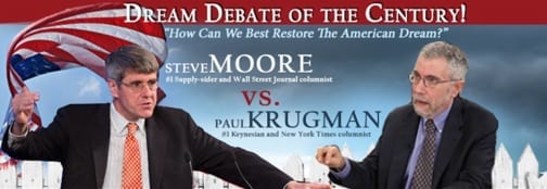 I spent time last weekend with Steve Moore, the Heritage Foundation’s chief economist and a writer for The Wall Street Journal. Steve told me the Dream Debate of the Century between Paul Krugman and him, scheduled at FreedomFest, July 8-11, has generated a huge amount of buzz. “Everywhere I speak, that’s all they ask about,” Moore said. Krugman is the #1 New York Times columnist and an advocate of big government.