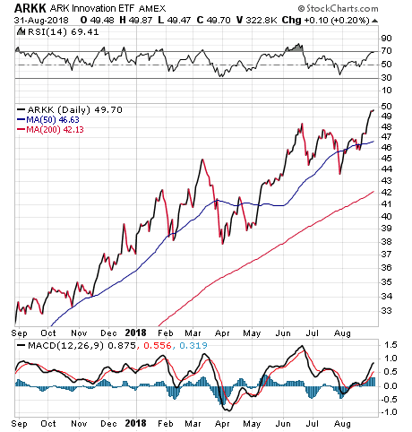 Dr. Mark Skousen’s Forecasts & Strategies investment advisory service earned a 64.1 percent return in Ford between December 2009 and January 2011 when the auto company struggled, but he is not investing directly in Tesla or any auto company right now. However, Skousen is recommending ARK Innovation (NYSE:ARKK), which recently hit an all-time high and has soared 34 percent so far this year. He advised his Forecasts & Strategies subscribers to buy the fund on December 18, 2017, and Tesla is ARKK’s top holding.