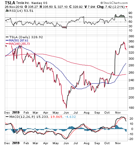 With Tesla having hit recent highs after notching its 3Q 2019 profit, rising 39 percent since Oct. 23 through Nov. 21, while the S&P 500 only gained about 3 percent, the lack of universal support for the Cybertruck and its design finally may bring a top to the swing trade on Tesla, Johnson wrote. However, Tesla is planning a media day about its electric vehicle battery and its management likely will talk about aggressive cost reduction targets, he added.
