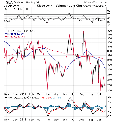 Investors took note and bid up Tesla’s stock price $33.19, or 12.72 percent, to close on Oct. 23 at $294.14. Even though Tesla reported a record $743 million loss in the second quarter of 2018, Musk has offered guidance that the company will turn a profit in the third quarter when it announces results on Oct. 24, more than a week earlier than originally planned.