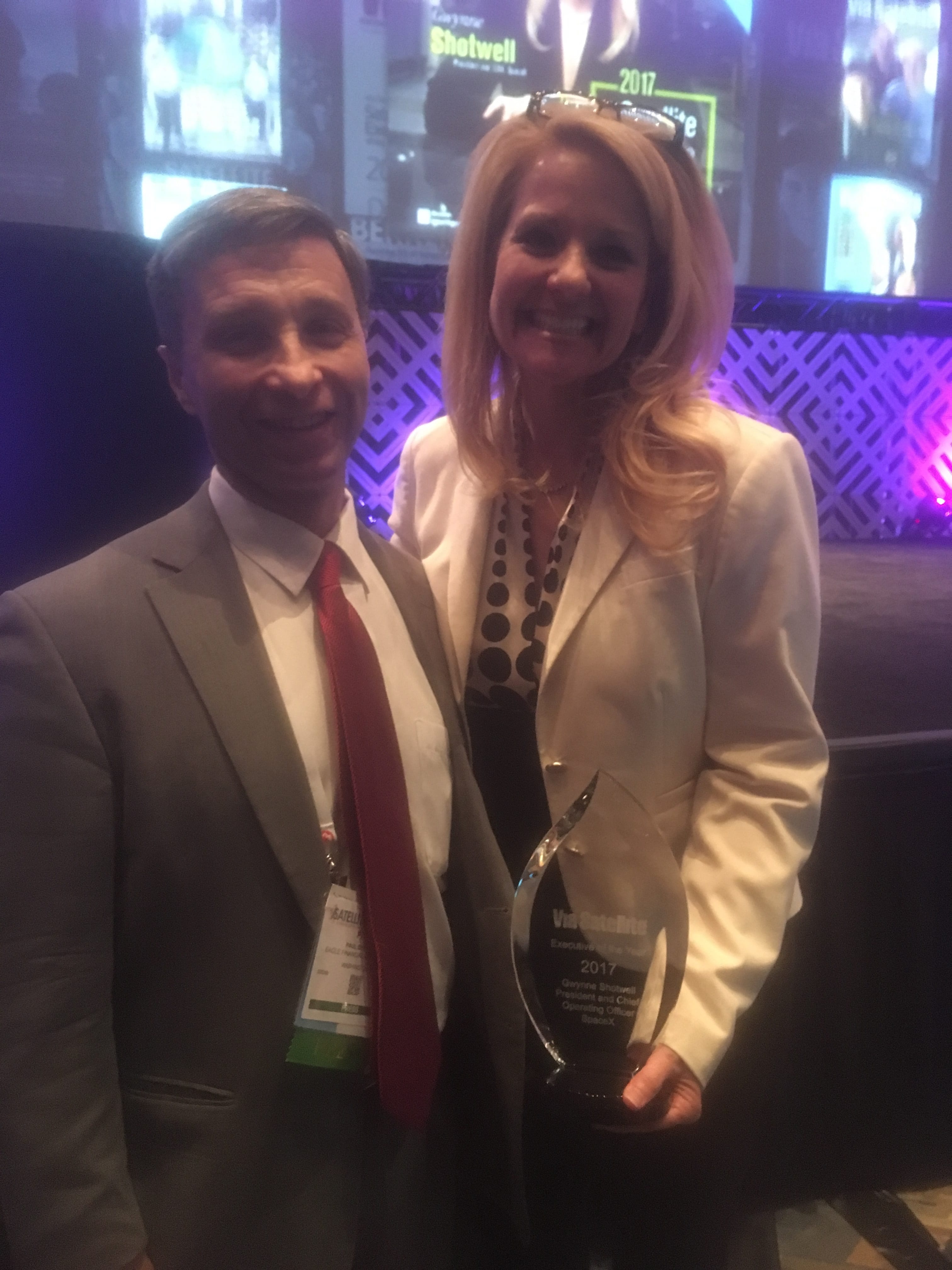 Columnist Paul Dykewicz poses for a photo with SpaceX President Gwynne Shotwell, after she discussed the timing of a potential IPO for the space company.