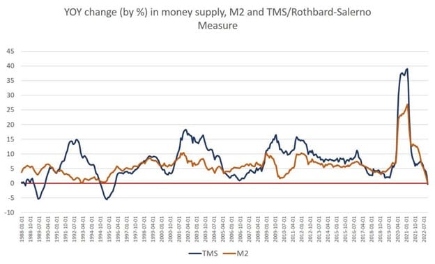The quantity of money (M2 or M3) should not be ignored, and it is sending out warning signs. As the following chart shows, the broad-based money supply has been extremely volatile since 2020. It ballooned during the COVID-19 pandemic in 2020-21 and has collapsed in 2020-23.