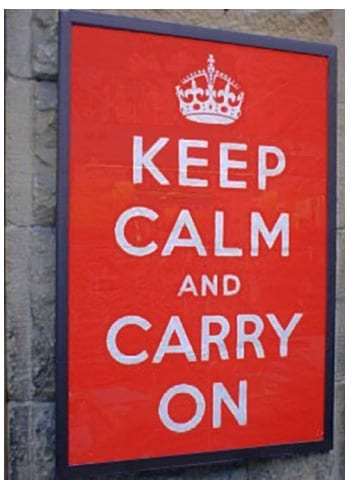 “Keep Calm and Carry On” was a poster produced by the British government in 1939 during the beginning of the Second World War to help raise the morale of the British public in the event of invasion.