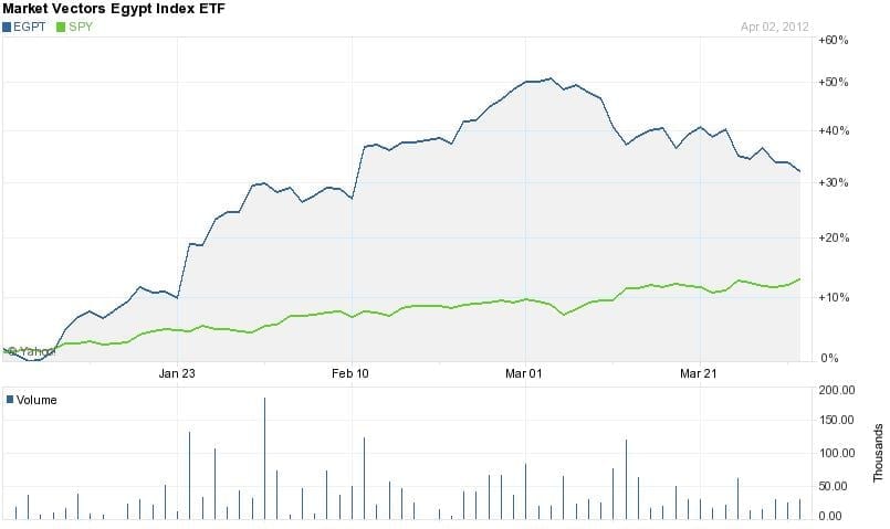 But the recent performance of the Market Vectors Egypt Index ETF (EGPT) would suggest otherwise. Despite its recent pullback, EGPT is still up 33.93% in 2012.