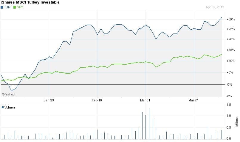 The iShares MSCI Turkey Invest Mkt Index (TUR) is up 28.94% in 2012.
