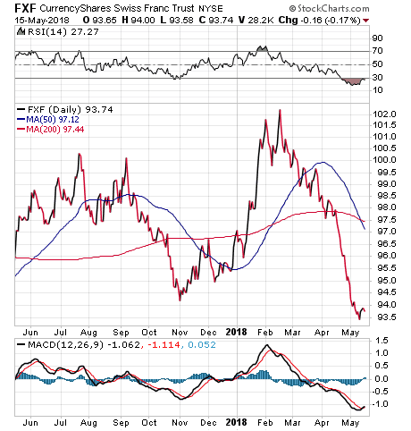 For investors who believe in the Wall Street maxim of “sell in May and go away,” an investment in a currency fund offers a way to diversify assets away from equities. Even though the Swiss franc may have further slippage ahead, it remains a favorite alternative for many investors to the U.S. dollar, and those who are patient may find the Swissie ripe for speculators to buy again whenever it starts to trend back up.