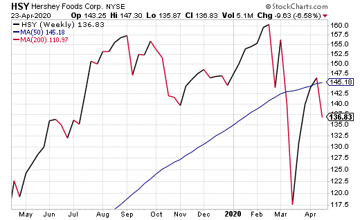 Chocolate is a low-cost “comfort indulgence” tailored for a recession, so it’s no wonder Hershey is up so far this year, despite the coronavirus crisis, Kramer said. She also suggested HSY as a bond replacement because it pays a dividend of 2.12%, which is currently far outpacing the returns from Treasury debt.