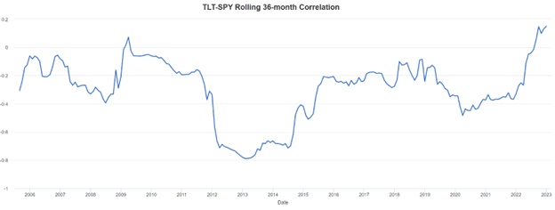 We looked at the correlation between the U.S. Treasury 20+ Year Bond Exchange Traded Fund (ETF) (NASDAQ:TLT) against the S&P 500 ETF (NYSEARCA:SPY) on a rolling 36-month basis.