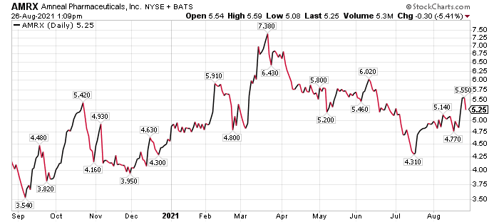 “One pure play I’d recommend right now: Amneal Pharmaceuticals Inc. (NYSE:AMRX), which shot into the market spotlight with generic epinephrine pens,” Kramer said. “But even though that initial surge is flattening out now, the stock is still interesting here below $5. You’re effectively paying under six times earnings for long-term EPS expansion of around 12% a year, which is classically an attractive price for that kind of growth profile.”
