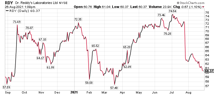 Analysts at Barclays PLC upgraded its rating of Dr. Reddy on Feb. 2 to “overweight” from an “equal weight” rating due to the company’s planned launch of its Sputnik vaccine. The heightened rating also included an increased price target of $70.00, up from $56.00. The stock subsequently showed those projections were conservative when the share price closed at $73.51 on July 13.