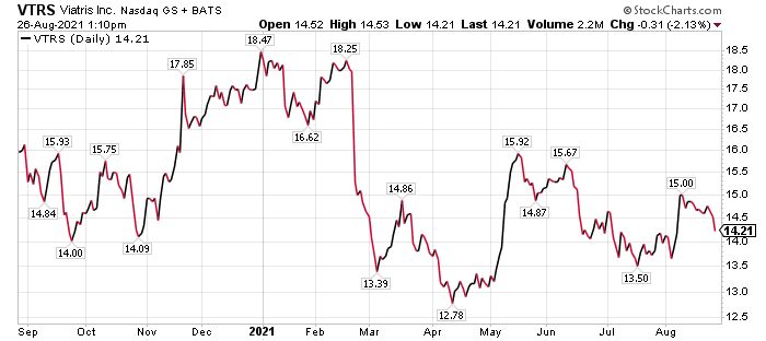 Otherwise, investors probably are better off simply buying into a big pharmaceutical manufacturer like Viatris Inc. (NASDAQ:VTRS), a Canonsburg, Pennsylvania-based specialty and generics drug company that was formed by a merger between Pfizer’s (NYSE: PFE) Upjohn legacy brands business and Mylan, a generic and biosimilar drug manufacturer. Viatris has a “commanding franchise” and pays a 3% dividend as a bonus, Kramer counseled.