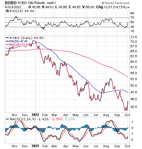 Carlson suggested Robo Global Robotics and Automation (ROBO), a fund that seeks to follow an index that is concentrated in robotics-related or automation-oriented companies. The fund had decent performance until 2022 when it plunged. The fund became caught in the downdraft that befell technology and industrial companies.