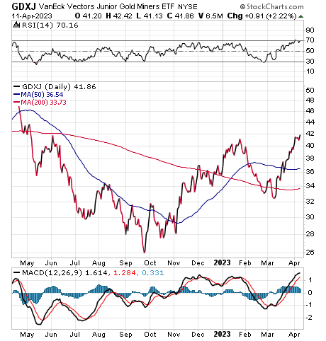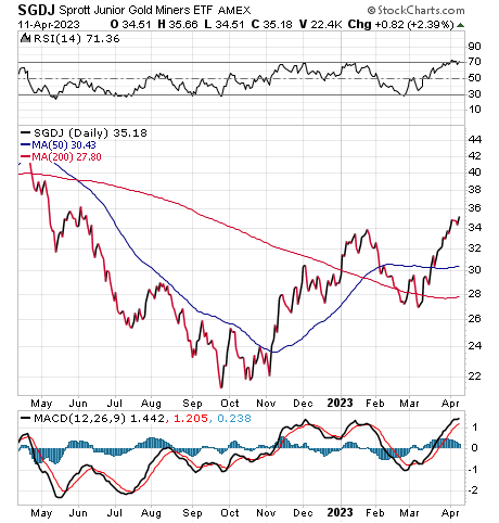 ETFs that focus on junior miners include Sprott Junior Gold Miners (NYSE Arca: SGDJ) and VanEck Junior Gold Miners (NYSE: GDXJ), Carlson said.