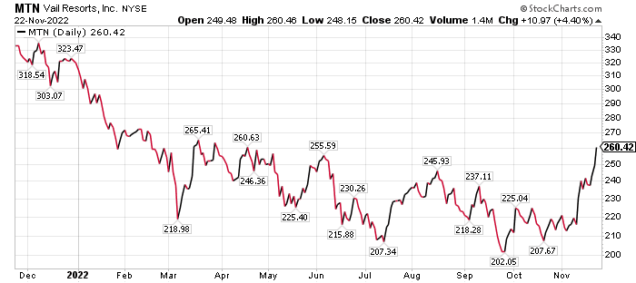 • Strong growing revenues in a softening economy. Despite MTN increasing ticket prices 7.5%, the company’s revenue from ski passes was already up 7% for the year through the end of September 2022.