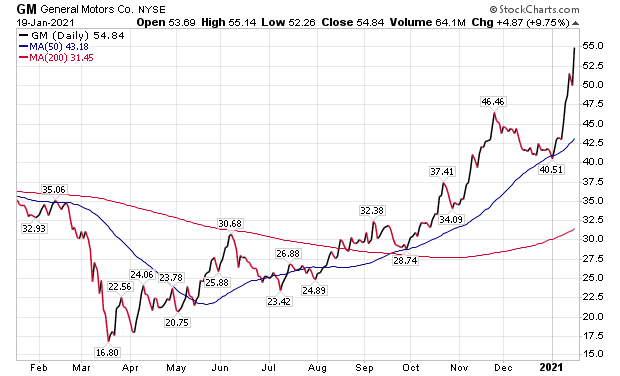 Perry, who also leads the Cash Machine investment newsletter, as well as the Premium Income, Hi-Tech Trader and Breakout Profits Alert advisory services, noticed GM shares tick up and recommended them on Jan. 13, when Nomura/Instinet raised its rating on the stock to buy from neutral and boosted its price target to $60 from $27. The upgrade followed revisions to GM’s powertrain electrification in the United States and China, aided by cost sharing with its Honda alliance and savings from North American restructurings.