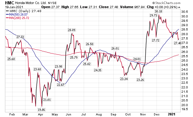 Honda gained headlines on Jan. 7 for an expected cut to vehicle production due to a semiconductor supply shortage. With autos requiring computer chips for their increasing use of technology, that news preceded a recent dip in the company’s share price.