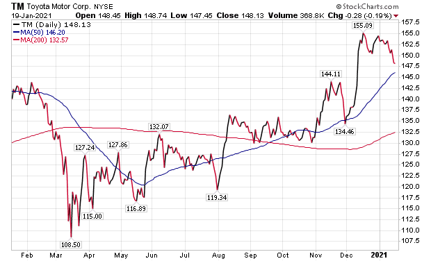 Toyota, a personal stock holding of mine for many years, is focused on becoming a leader in the EV industry, particularly in its home market of Japan. Its price dipped recently when it announced on Jan. 14 that it would need to pay $180 million to settle a U.S. government investigation into delayed disclosures on emissions-related defects.