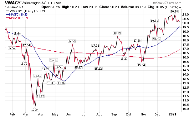 Volkswagen’s EV ambitions remain to be realized. One of the last upgrades of the stock occurred on Dec. 15 when Bernstein boosted its rating to “market perform” from “underperform.” The stock is worth tracking and considering for investment later this year if its trajectory heads forward with any sustainable momentum.