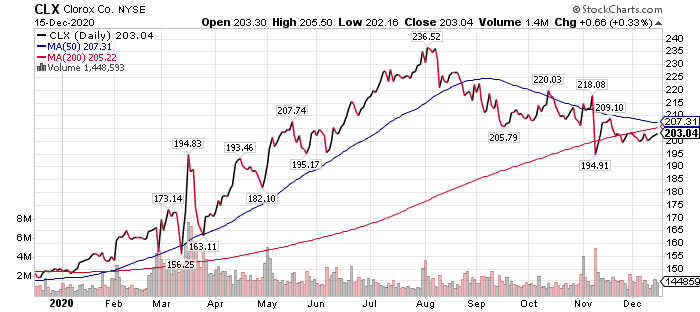 The stock also currently is selling well below its August high, Carlson continued. Plus, unlike most other stocks in this sector, Clorox offers a nice dividend yield of 2.19% and has a history of increasing its payout, he added.