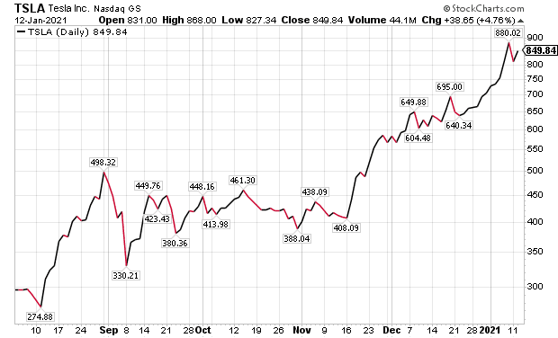 Barclays currently rates Tesla as a stock to “underweight” after its share price rocketed past the investment firm’s $230 target to close at $847.44 on Jan. 12. On that basis, the potential downside for new investors in the stock is 72.9%.