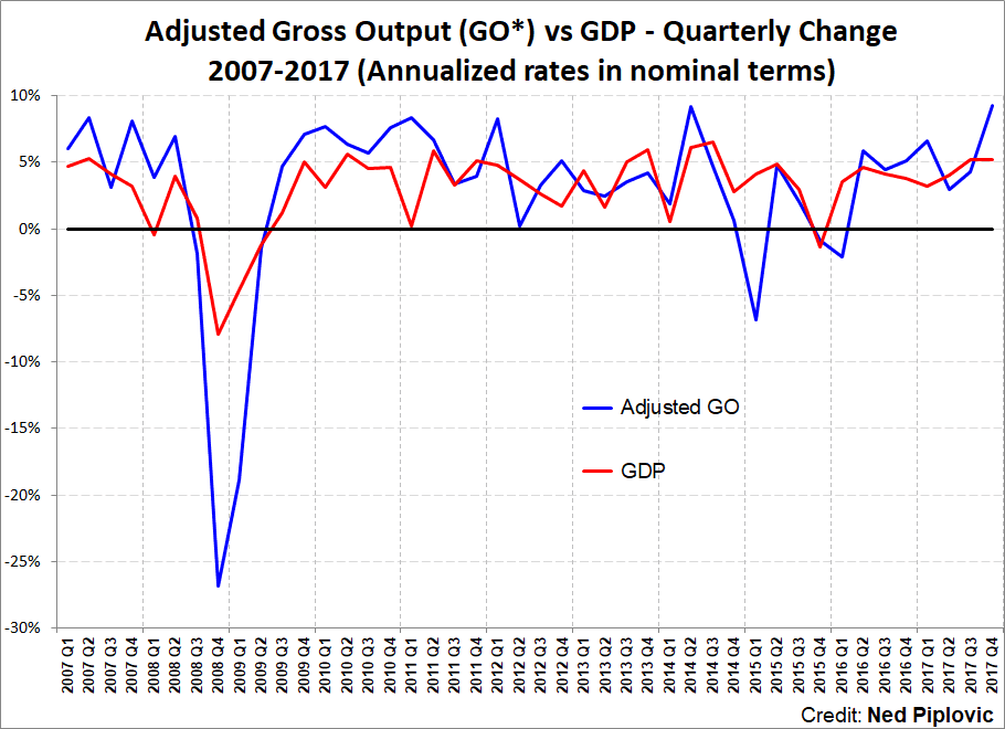 Unfortunately, GO data comes out after GDP data, and we won’t have first-quarter 2018 GO figures until July 20, right after FreedomFest. The good news is that BEA director Brian Moyer indicates that the government will start releasing GO at the same time as GDP by 2019. Stay tuned!