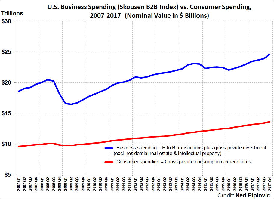 Thus, GDP is a flawed measure of the economy, overvaluing consumption at the expense of business investment. B2B spending actually rose almost 9% in real terms in the fourth quarter, three times faster than the third quarter. That’s a record.