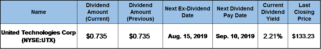 In addition to a dividend yield that exceeds the industry averages and a long streak of annual dividend hikes, the company has also delivered moderate asset appreciation and steady total returns on shareholders’ investments. Before taking a position in the United Technologies stock, interested investors must conduct their own analysis to confirm that this stock has positive outlook and fits within the investors’ overall portfolio strategy. To take advantage of the dividend distribution timing and collect the next round of dividend payouts on the September 10, 2019, pay date, investors must claim stock ownership before the August 15, 2019, ex-dividend date.