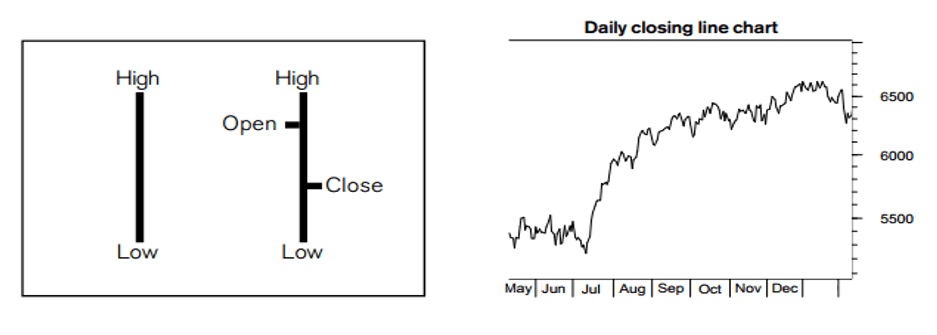 There are thousands of different charts that can be used to analyze the options and their underlying securities. However, I will focus on two common types of charts only. A simple line chart and a bar chart that shows the opening price, the closing price, the high price and the low price are all you will need to determine your options strategy.