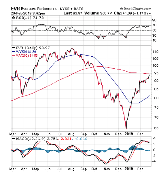 While it will be tough to beat that performance this year, economic clouds on the horizon ultimately could aid Evercore’s business more than many investors expect, based on its current valuation of just 11 times earnings, compared to 18.21 times earnings for the Dow Jones Industrial Average, 20.23 for the S&P 500, 22.15 for the Nasdaq 100 and 53.15 for the Russell 2000. Evercore also offers a dividend yield of 2.23 percent.