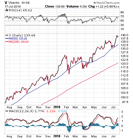 After soaring 21.80 percent so far in 2018 and 43.65 percent in the past year, the share price of Visa is showing no signs of topping out. Both Visa and its chief rival, Mastercard (NYSE: MA), have been beating the market and posting impressive sales and earnings figures.