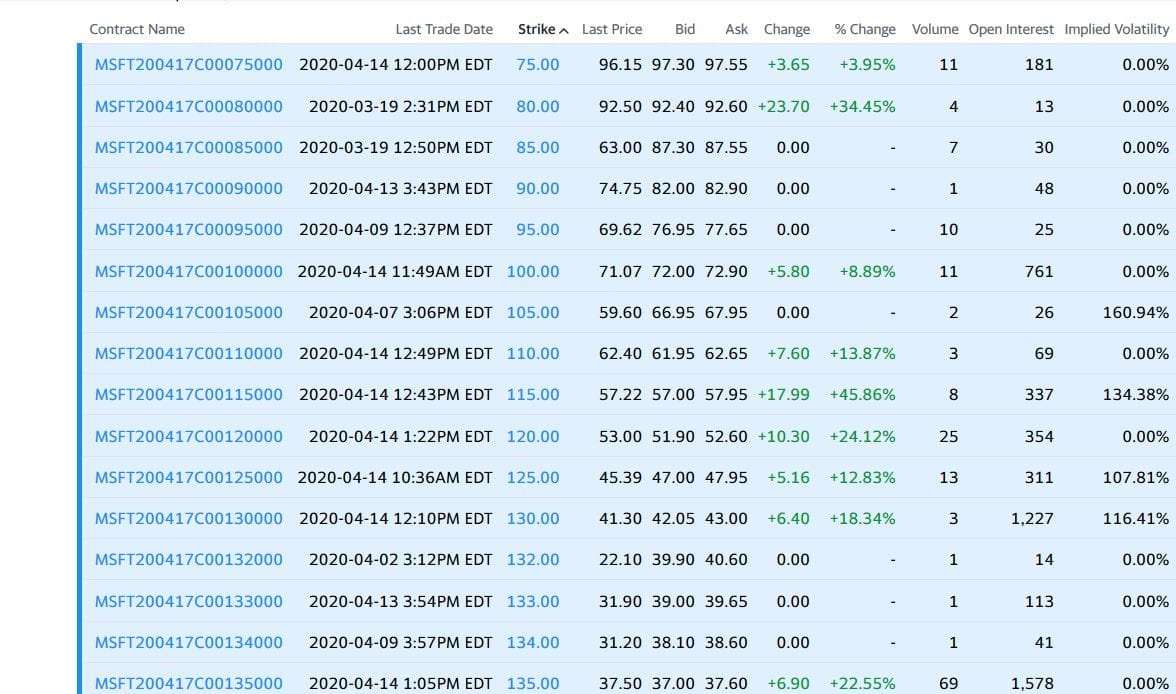 The first column lists the different trading symbols for each call option. Each symbol represents which stock this option belongs to, when the option expires, if it is a call or put option and the strike price. Let’s look at the symbol, “MSFT200417C00135000.” “MSFT” means that the underlying stock of this option is Microsoft. “200417” means that this option is expiring on April 17, 2020. “C” indicates it is a call option. “00135000” indicates that the strike price is $135.