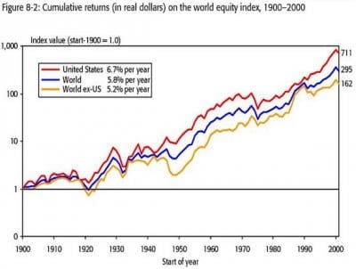 After all, the survey does not include the numerous countries that do not have sufficient data or whose stock exchanges were forced to shut down during the 20th century. Not a single country in Latin America is included in the survey — not even Mexico, Brazil or Argentina. That’s because their economic conditions were so bad that their stock exchanges were moribund or closed for years.