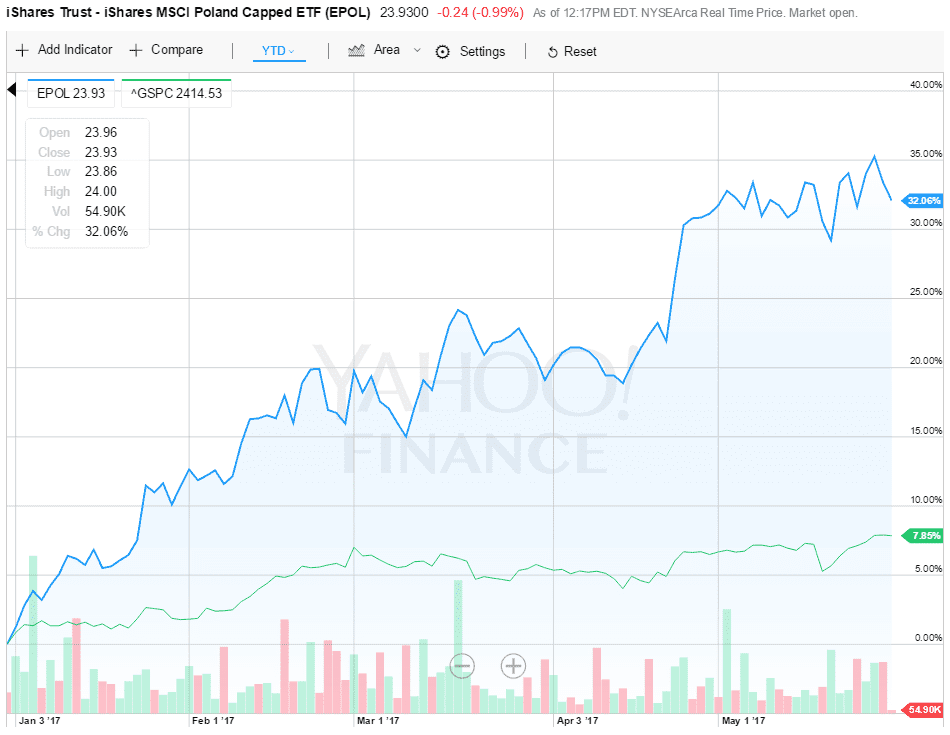iShares MSCI Poland Capped ETF (EPOL) versus the S&P 500 year to date.