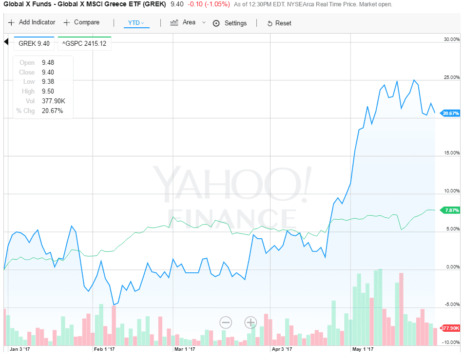 You may be surprised to learn that this crisis-wracked country is the ninth-best performing foreign stock market ETF among 47 global markets in 2017. With $376 million in assets, GREK is up 21.95% year to date.