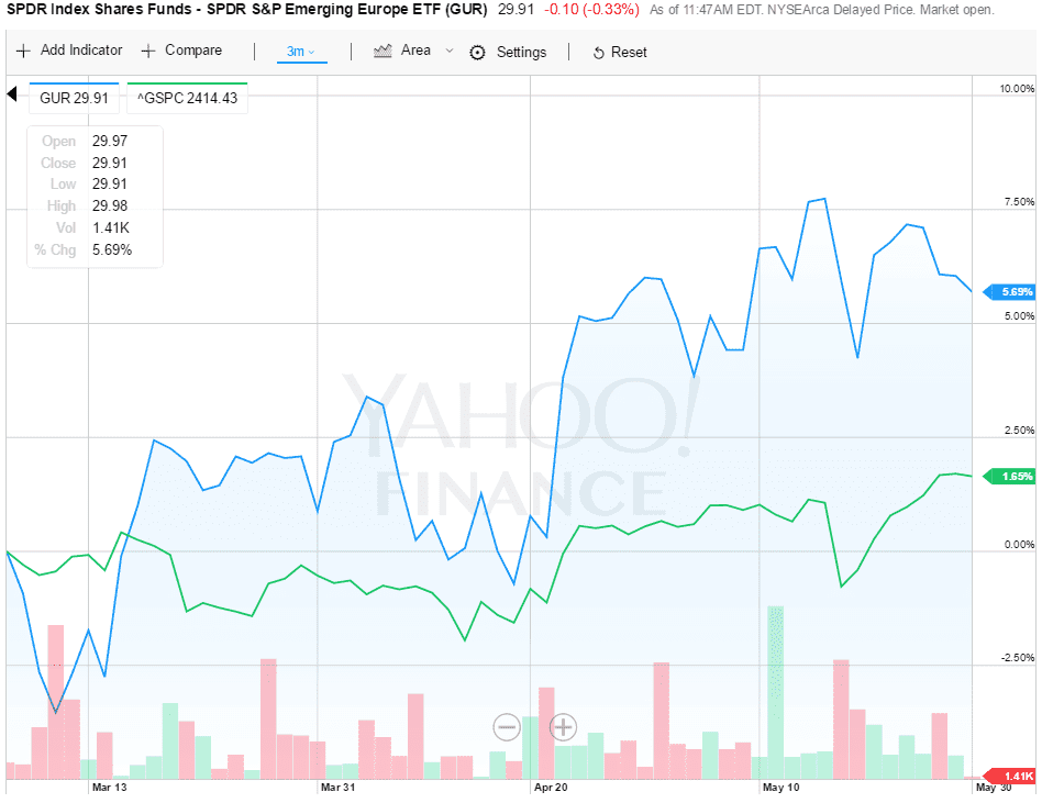 S&P 500 Emerging Europe ETF (GUR) versus the S&P 500 over three months.