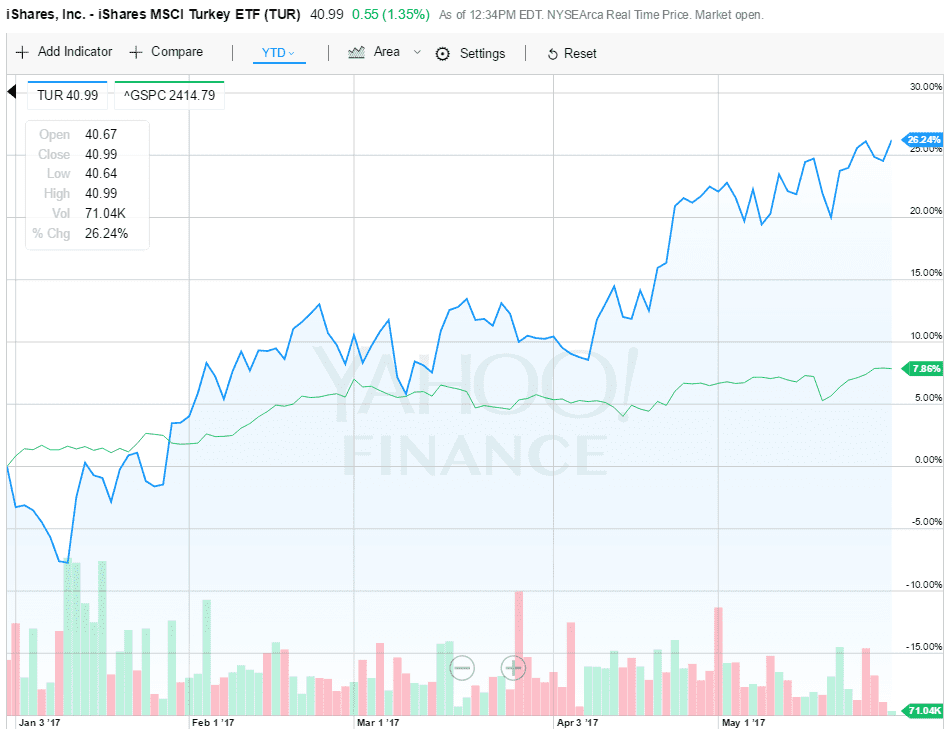iShares MSCI Turkey (TUR) versus the S&P 500 year to date.